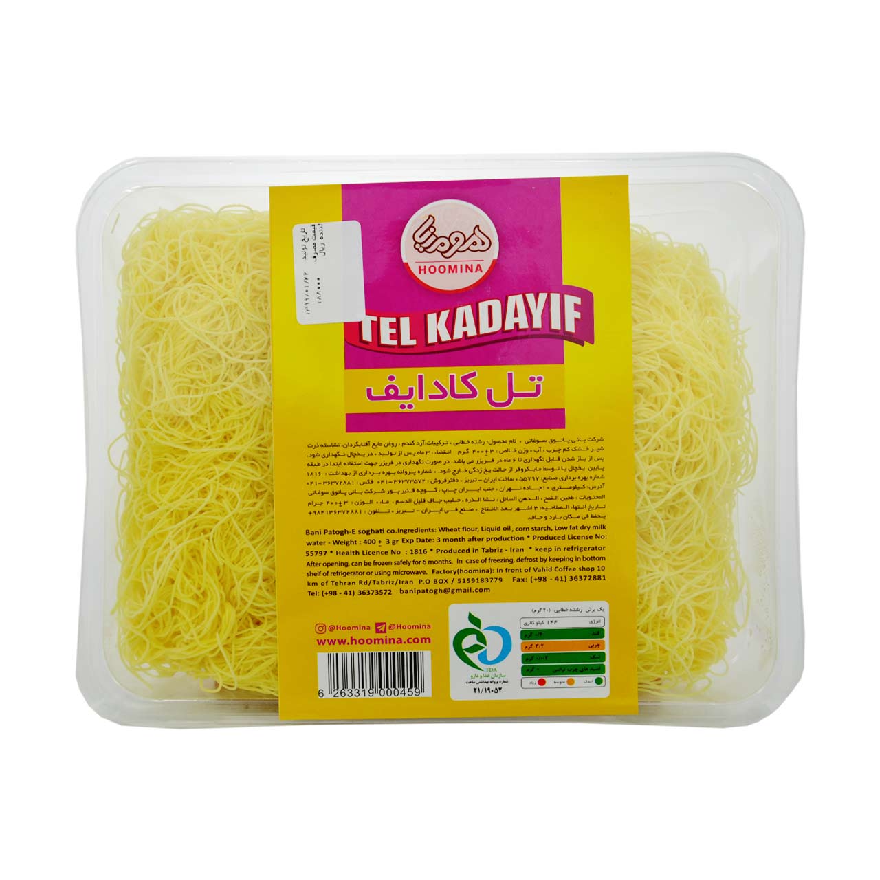 رشتههای باریک تل کادایف داخل یک بستهبندی مناسب گنجانده شدهاند. تل کادایف در واقع از آرد، روغن مایع و نشاسته ذرت وشیر خشک کم چرب و آب تهیه میشود و پس از باز شدن برای مدت زمان 6 ماه داخل فریزر قابل نگهداری است. لازم به ذکر است که کادایف تر از پرطرفدارترین کادایف ها در کشور ترکیه است که برای درست کردن انواع دسر و شیرینی جات از آن استفاده می کند.